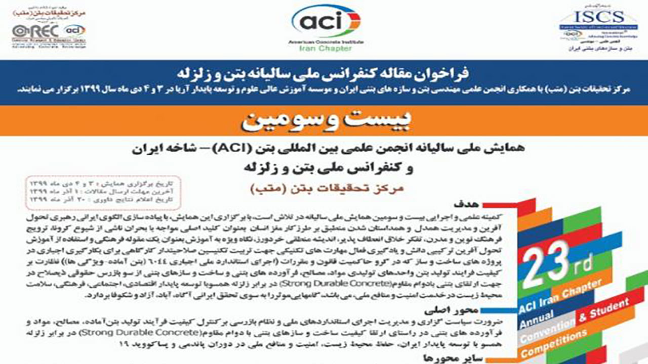 منبع بتن و زلزله – ۱۳۹۹ – دوره : ۲۳ – بیست و سومین همایش ملی سالیانه انجمن علمی بین المللی بتن آمریکا (ACI)- شاخه ایران و کنفرانس ملی بتن و زلزله – کد همایش: ۹۹۲۰۰-۵۱۰۷۸