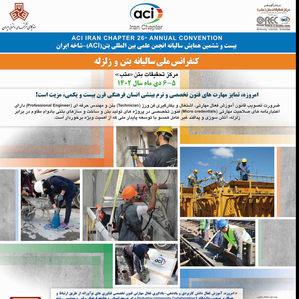 آغاز ثبت نام بیست و ششمین همایش سالیانه انجمن علمی بین المللی بتن آمریکا (ACI) – شاخه ایران و کنفرانس ملی بتن و زلزله مرکز تحقیقات بتن (متب)، ۵ و ۶ دی ماه سال ۱۴۰۲ در محل اتاق بازرگانی ایران. جهت ثبت نام و کسب اطلاعات بیشتر به وب سایت مراجعه و یا با دبیرخانه همایش تماس حاصل نمایید: