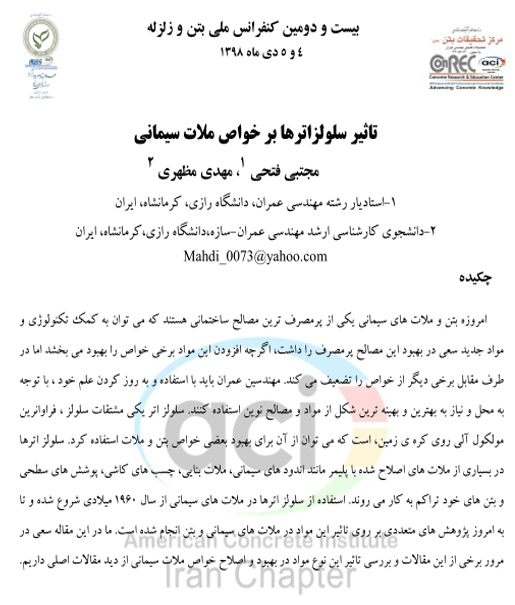 امروزه بتن و ملات های سیمانی یکی از پرمصرف ترین مصالح ساختمانی هستند که می توان به کمک تکنولوژی و مواد جدید سعی در بهبود این مصالح پرمصرف را داشت، اگرچه افزودن این مواد برخی خواص را بهبود می بخشد اما در طرف مقابل برخی دیگر از خواص را تضعیف می کند. مهندسین عمران باید با استفاده و به روز کردن علم خود ، با توجه به محل و نیاز به بهترین و بهینه ترین شکل از مواد و مصالح نوین استفاده کنند. سلولز اتر یکی مشتقات سلولز ، فراوانرین مولکول آلی روی کره ی زمین، است که می توان از آن برای بهبود بعضی خواص بتن و ملات استفاده کرد. سلولز اترها در بسیاری از ملات های اصلاح شده با پلیمر مانند اندود های سیمانی، ملات بنایی، چسب های کاشی، پوشش های سطحی و بتن های خود تراکم به کار می روند. استفاده از سلولز اترها در ملات های سیمانی از سال ۱۹۶۰ میلادی شروع شده و تا به امروز پژوهش های متعددی بر روی تاثیر این مواد در ملات های سیمانی و بتن انجام شده است. ما در این مقاله سعی در مرور برخی از این مقالات و بررسی تاثیر این نوع مواد در بهبود و اصلاح خواص ملات سیمانی از دید مقالات اصلی داریم.